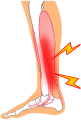 かかとの後ろに痛みが出て、歩いたり走ったりすると強く痛むのが特徴です。酷い場合はかかとをつけて歩けなくなることもあります。